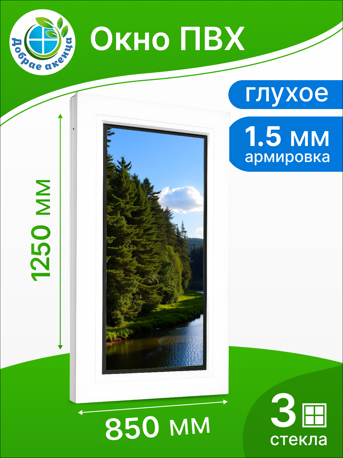 Глухое окно ПВХ.СТБ 1108-2017. Ширина 850 мм, высота 1250 мм(+подставочный профиль 30мм). Двухкамерный стеклопакет( 3 стекла). Подходит для установки в жилых и общественных зданиях.