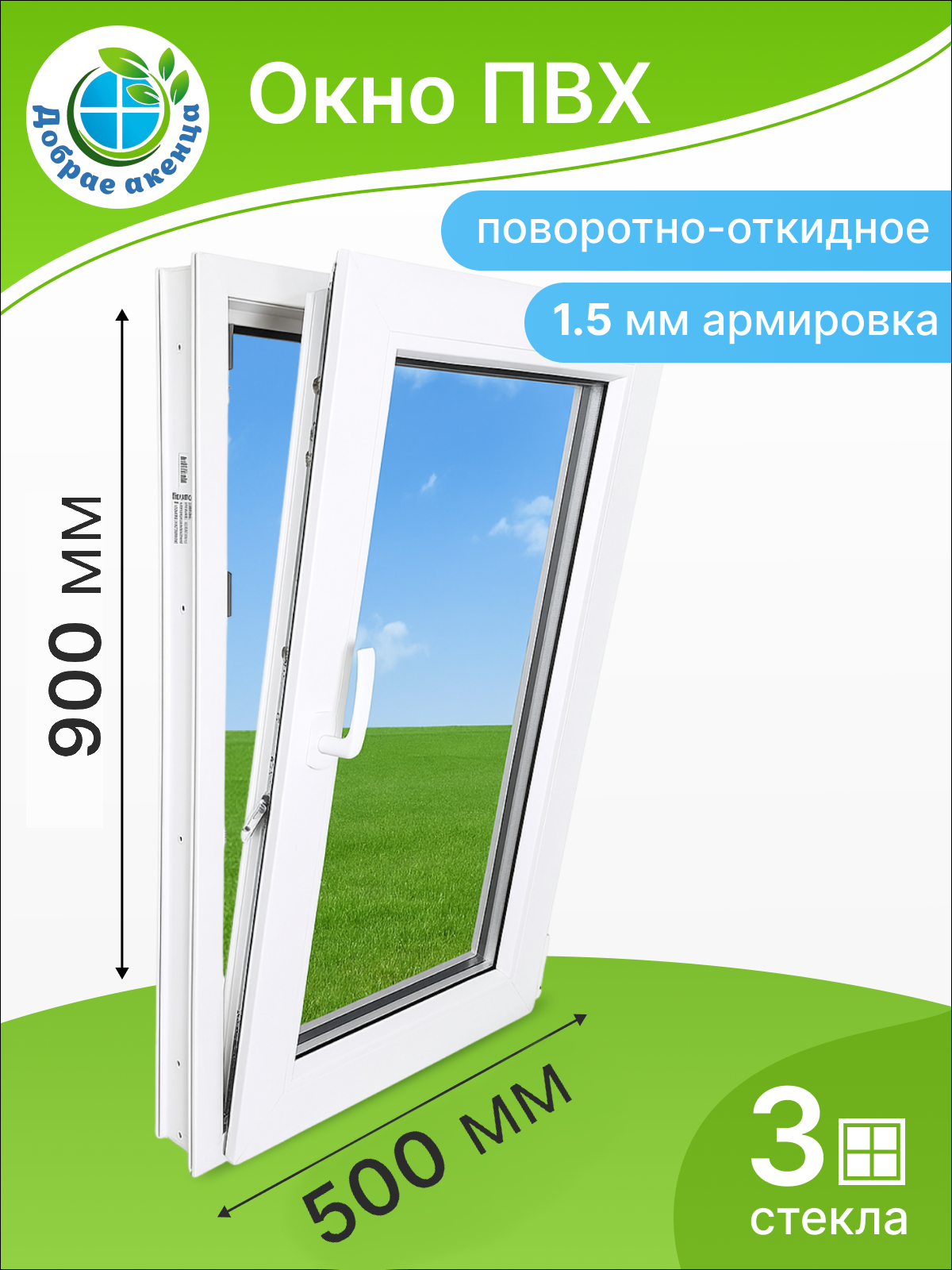 Поворотно-откидное окно ПВХ. Ширина 500 мм, высота 900 мм(+подставочный профиль 30мм). Двухкамерный стеклопакет( 3 стекла). Подходит для установки в жилых и общественных зданиях.